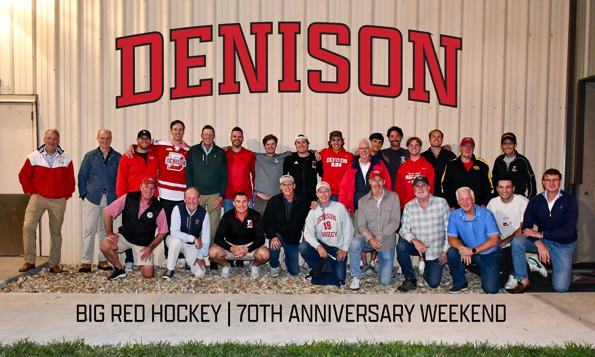 Big Red Hockey alums Matt Smith ’77 and Bill Powell ’77 take a selfie at BRW 2025 (above); alums gather to celebrate Big Red Hockey’s 70th anniversary (below).